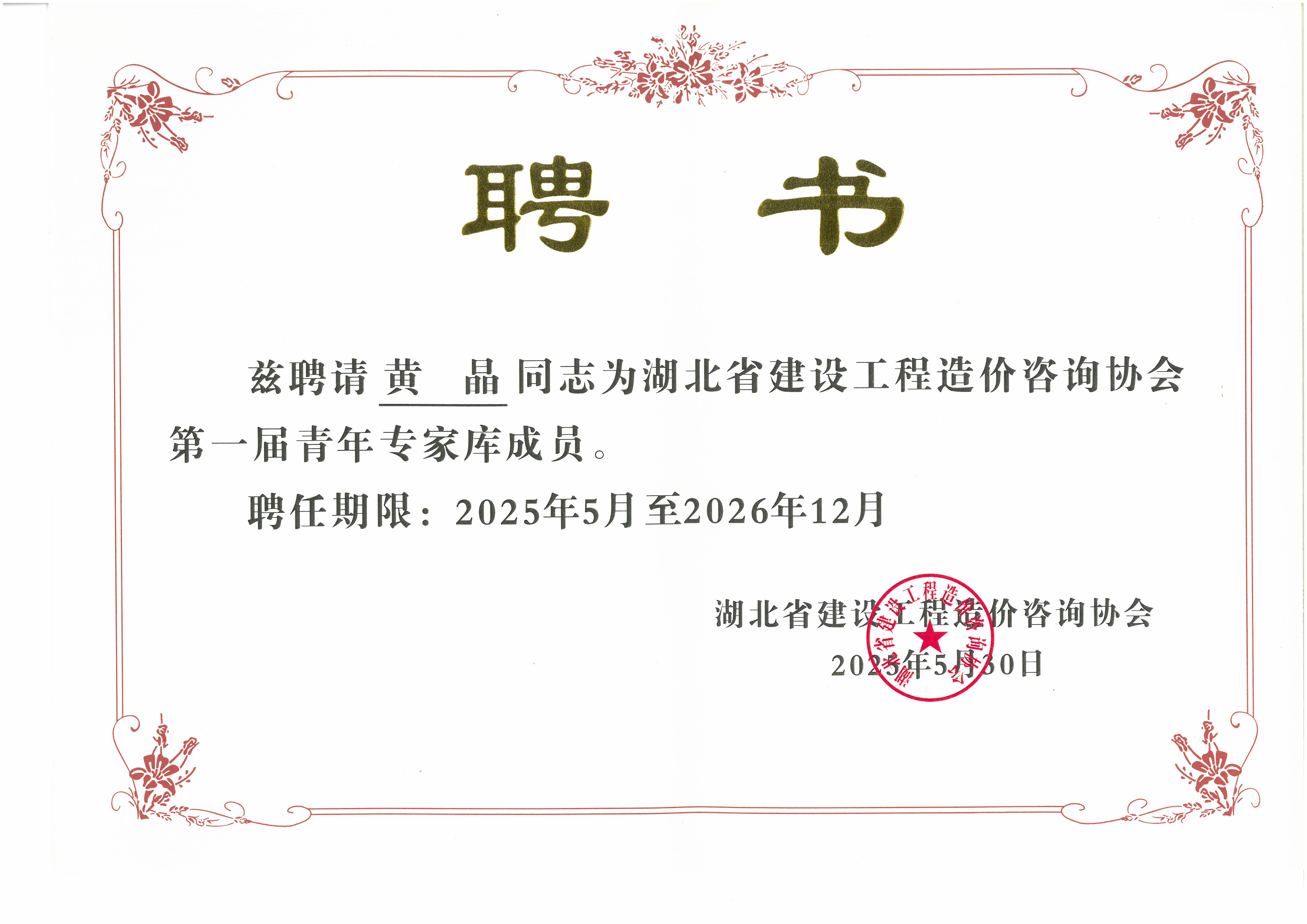 隨著湖北省建設(shè)工程造價(jià)咨詢協(xié)會(huì)第一屆青年專(zhuān)家?guī)烀麊握焦迹宜军S晶憑借扎實(shí)的專(zhuān)業(yè)知識(shí)、豐富的實(shí)踐經(jīng)驗(yàn)以及在行業(yè)內(nèi)的良好口碑,成功入選,成為該專(zhuān)家?guī)熘械囊粏T!